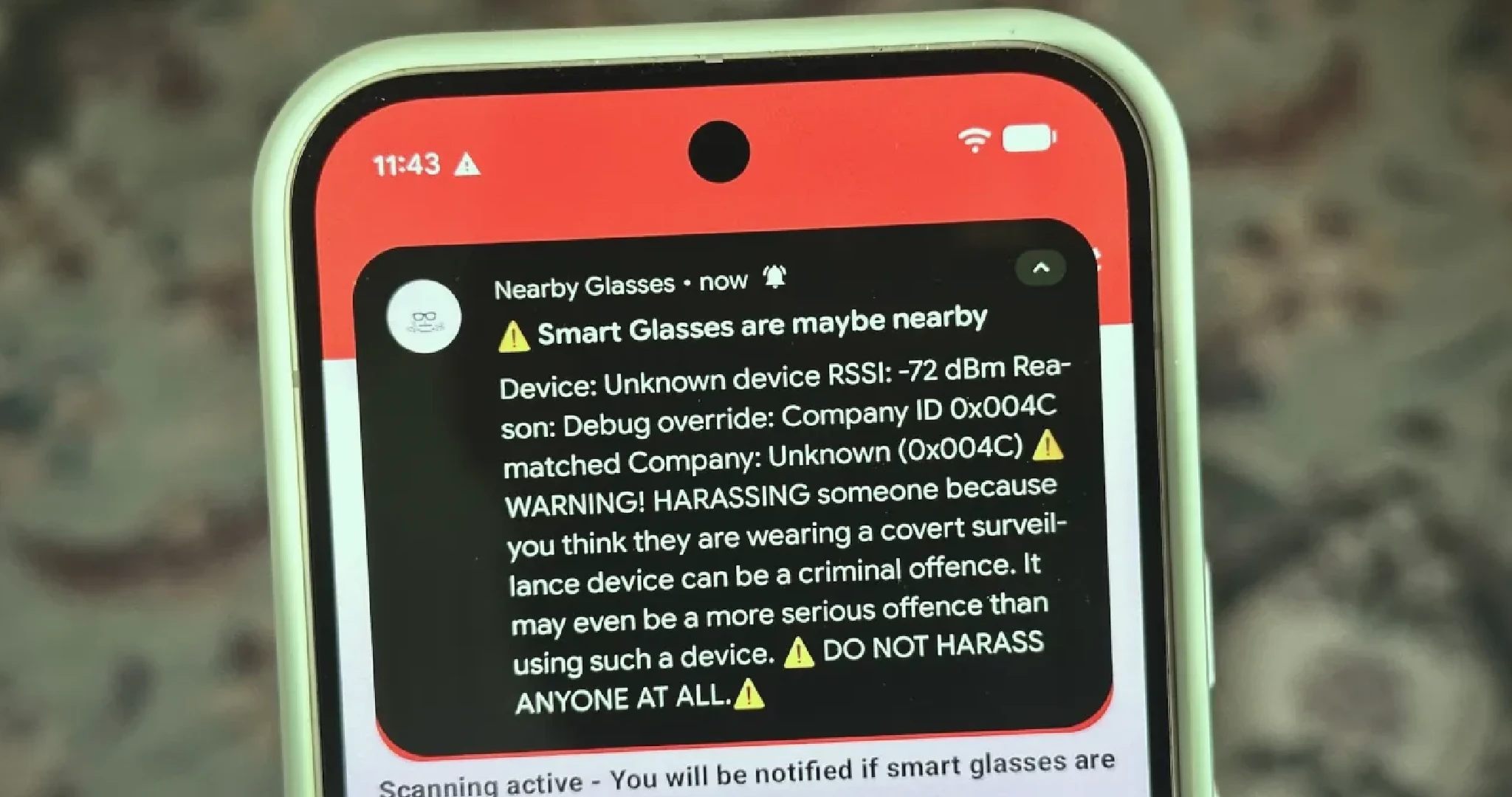 The result: no alerts for smart glasses, suggesting none were detected nearby.